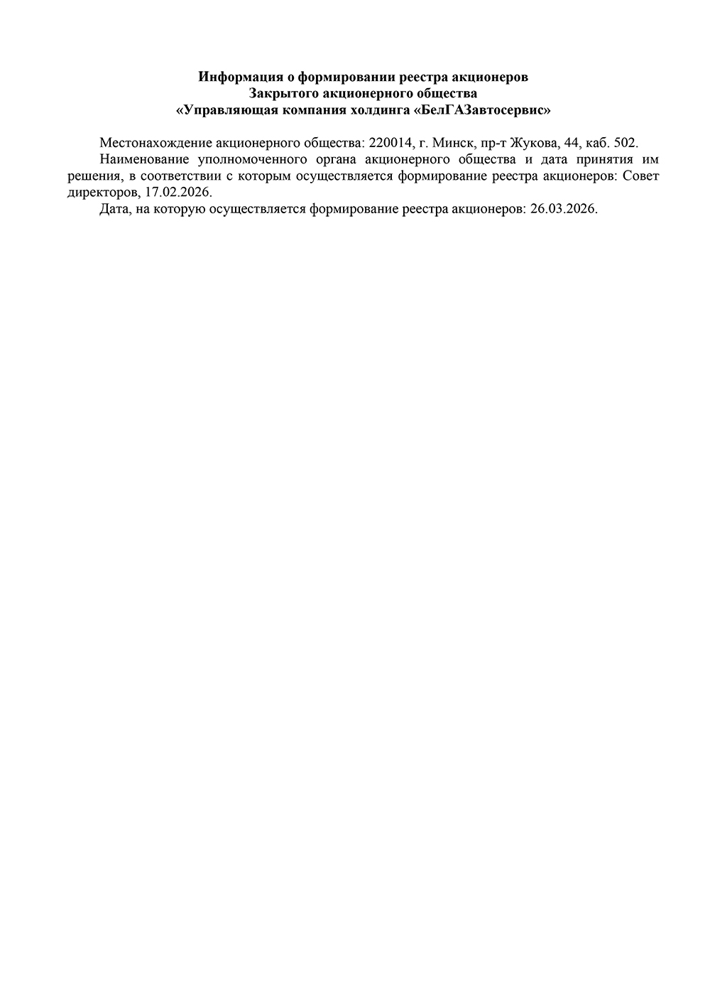 Информация о формировании реестра акционеров Закрытого акционерного общества «Управляющая компания холдинга «БелГАЗавтосервис»