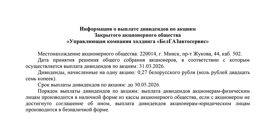 Информация о выплате дивидендов по акциям Закрытого акционерного общества «Управляющая компания холдинга «БелГАЗавтосервис»