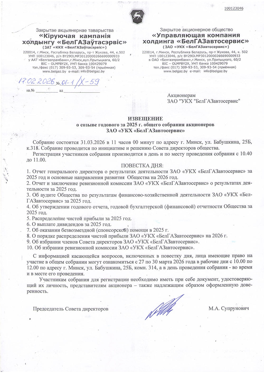 Извещение о созыве годового за 2025 г. общего собрания акционеров ЗАО «УКХ «БелГАЗавтосервис»